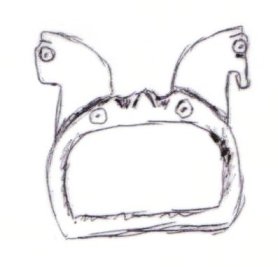 The majority of horsehead buckles are D rings. However, it seems impossible for the horsehead buckles to have derived originally from dolphin D rings. The modelling of the dolphins on almost all dolphin D rings is much simpler, more abstract, and probably later than a large proportion of horsehead buckles (1, 2, 3). This suggests that if the dolphin D rings and the horseheads are related, the dolphin D rings are derived from the horseheads rather than the other way round.