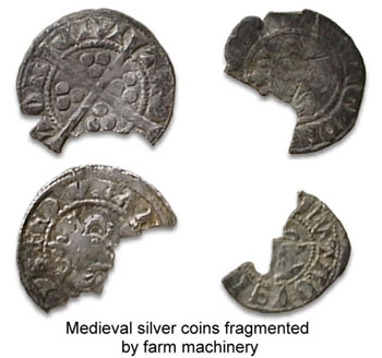 Chemicals, however, are not the only threat faced by objects in the ground. The mechanisation of almost every aspect of agriculture makes long-term survival of any object within ploughsoil virtually impossible. Pre-historic stone implements and metallic objects are equally vulnerable. Even the smallest and lightest of items are cut to pieces, and any information they might have yielded is lost forever. The medieval silver coins shown below are all less than 20 mm diameter, but nothing escapes the high-speed blades of modern cultivators.