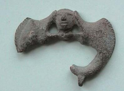 Human heads have appeared on at least two buckles found in continental Europe, but both come form Germany, and probably from northern Germany. The lack of parallels elsewhere on the continent, and the larger number of head buckles found in Britain, suggests that the head buckles are primarily a British phenomenon. Supporting this interpretation is the fact that one of the German buckles (1) has unusual archaising features and big crests, both suggestive of British buckles, and, in addition, the head on the other buckle (2), while it has clear hair, has rather confused facial features which suggest it could be a copy made out of cultural context.