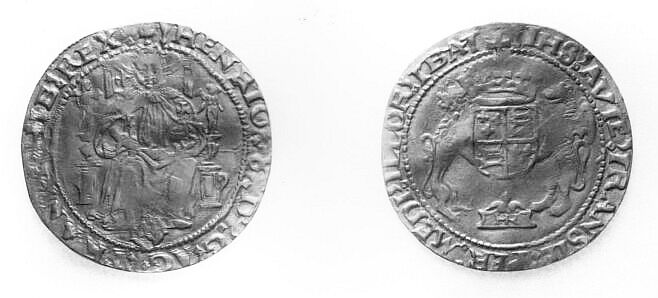 The mint mark is an arrow dating this coin to 1547-1549 so it is a posthumous coin using Henry's name but actually issued during the reign of Edward VI. The half sovereign of this posthumous issue is the only denomination to depict the youthful figure of Edward VI enthroned on the obverse. The legend reads:-