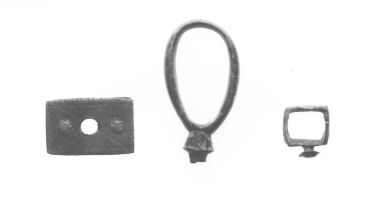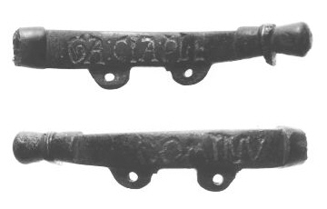 This is one of the two arms (or bar) from a purse-frame and you can clearly see the loops to which the fabric of the purse was attached. It is nicely inlaid with niello and inscribed on one side GA: CIA PLE and on the other A DOMINV. This Latin inscription is part of the greeting by the angel Gabriel to the Virgin Mary at the Annunciation and is still used as a common Catholic prayer today:-