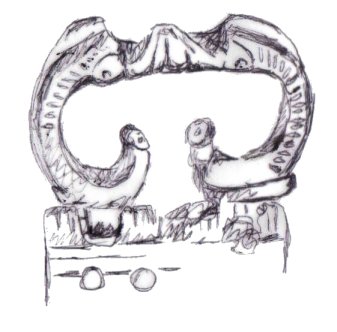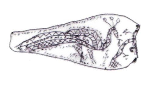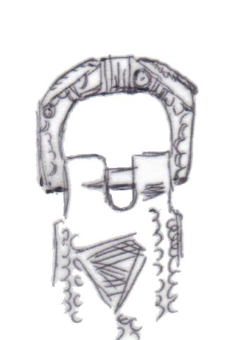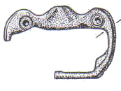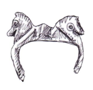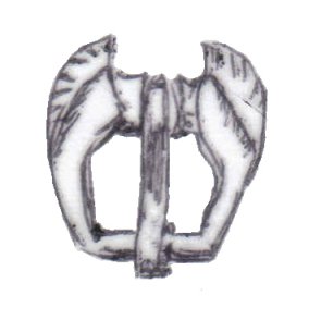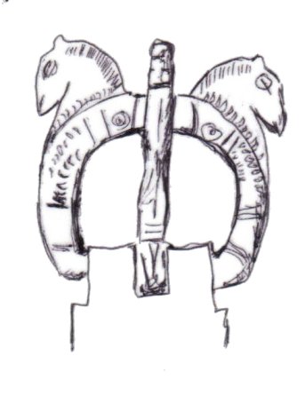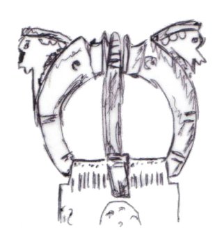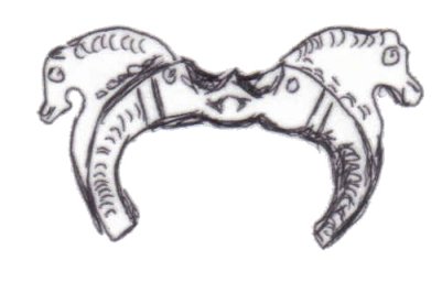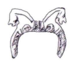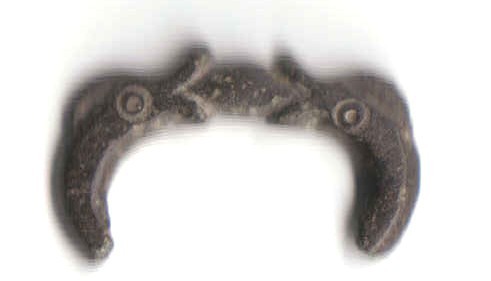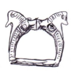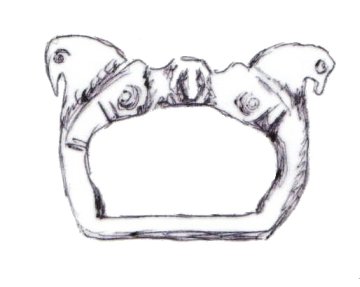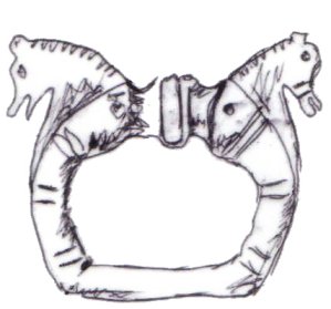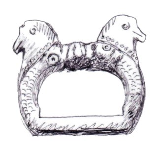 The majority of horsehead buckles are D rings. However, it seems impossible for the horsehead buckles to have derived originally from dolphin D rings. The modelling of the dolphins on almost all dolphin D rings is much simpler, more abstract, and probably later than a large proportion of horsehead buckles (1, 2, 3). This suggests that if the dolphin D rings and the horseheads are related, the dolphin D rings are derived from the horseheads rather than the other way round.