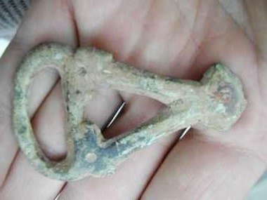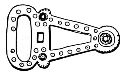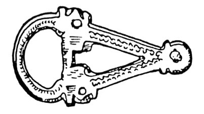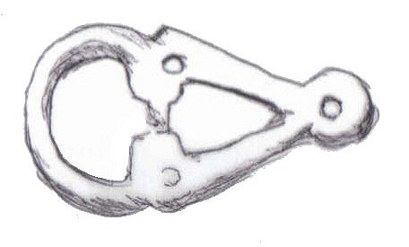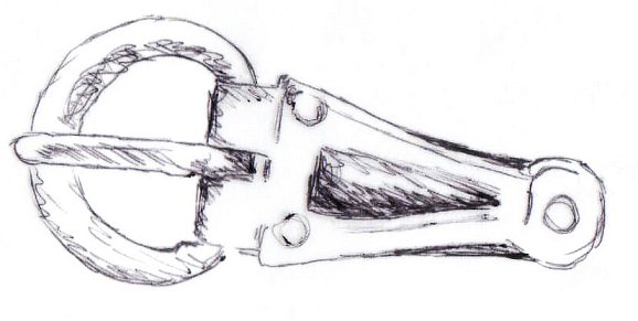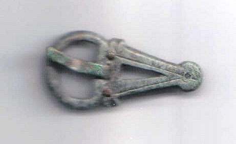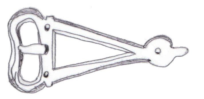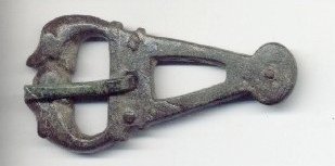 It has been argued that the latest Roman British triangular buckles could be the precursors of the Anglo-Saxon triangular buckles. This is possible, and certainly some British buckles with their flatter loops (10, 11) begin to look more like Anglo-Saxon types, and the Enfield buckle (12) does look quite like a ?missing link? between Roman British and Anglo-Saxon triangular types. In the absence of other Enfield type buckles, however, it is hard to be sure, and it is equally possible that the transition to the later Germanic buckles occurs on the continent and is then imported into England via the well-developed contacts between the Franks and Kent. For another (probably continental) ?missing link? (see 14).